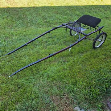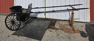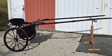 96 inch shafts, black with red stripe, wood wheels, patent boot, chrome rail dash, flat cushion seat.